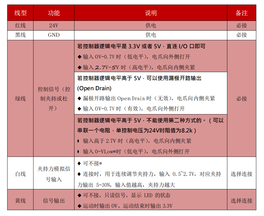 1. 白線不接的情況下,夾持力由電位器控制,白線連接時,夾持力由白線信號控制