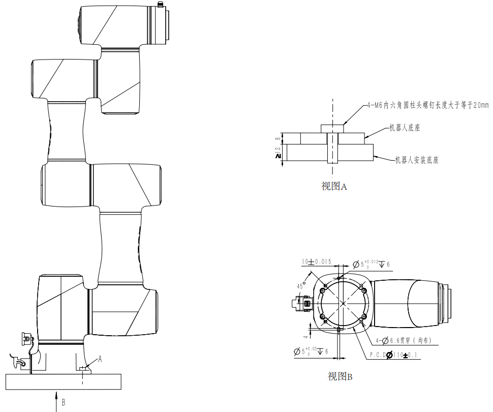 機械臂的安裝直接影響機械臂運行的穩定性。用戶在固定機械臂時可根據機械臂底座孔位尺寸以及真實環境自行設計選擇安裝臺架,且機械臂的安裝高度需要在0.6米以上。機械臂的固定臺架不僅需承受機械臂的重量,還需承受最大加速度運動時的動態作用力。將機械臂固定在臺架上時需注意: