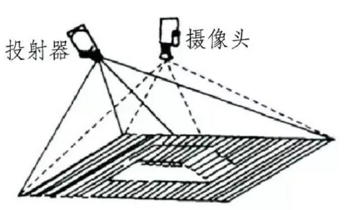 它通過一個光源投射出一束結構光,這結構光可不是普通的光,而是具備一定結構(比如黑白相間)的光線,打到想要測量的物體上表面
