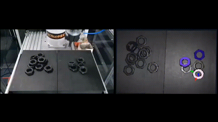 只見ABB機器人在顯揚科技的高速高清三維機器視覺設備引導下,準確地抓取起金屬螺母,并將其放置在另一側的指定位置。用ABB機器人代替人工后,企業的生成效率提高,工人可以投入到更有價值的工作。