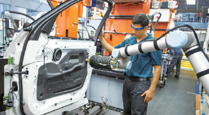 以汽車制造工廠為例,很多汽車裝備工序都市由人類員工手工完成,這樣裝配方式成本很高,而將人工全部替換為機(jī)器人在技術(shù)上并不現(xiàn)實(shí)。如果機(jī)器人和人類沒(méi)有緊密互動(dòng),則二者的生產(chǎn)潛力都無(wú)法發(fā)揮出來(lái)。協(xié)作機(jī)器人的出現(xiàn)把人類的靈活性、適應(yīng)性和解決問(wèn)題的能力與機(jī)器人的力量、耐久性和動(dòng)作的準(zhǔn)確性結(jié)合起來(lái),這將能顯著改善當(dāng)今生產(chǎn)裝配的困境。
