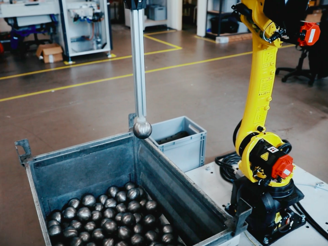 客戶需要把從容器中取出重金屬球形物體的過程自動化,這些金屬球是滾珠軸承的半成品,該任務目前是手動執行的,操作員從箱子中取出每個球,并將其插入測量機器中。新的自動化解決方案是為機器人抓取球提供一個簡單有效的系統,從而減少手動操作中涉及的體力活動。