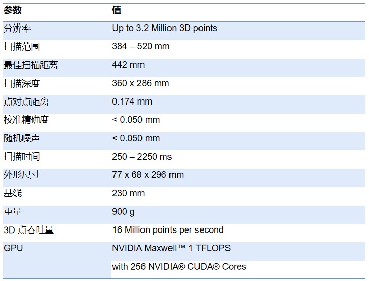 Photoneo PhoXi 3D Scanner XS參數如下: