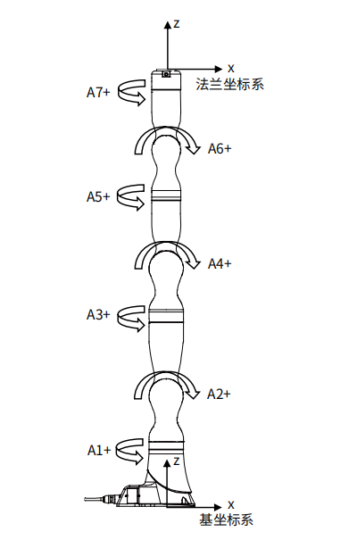 旋轉(zhuǎn)軸方向定義:各軸處于機械零位時,A1/A3/A5/A7 旋轉(zhuǎn)正向與基座標系+Z 方向一致,A2/A4/A6 旋轉(zhuǎn)正向與基座標系+Y 方向一致。