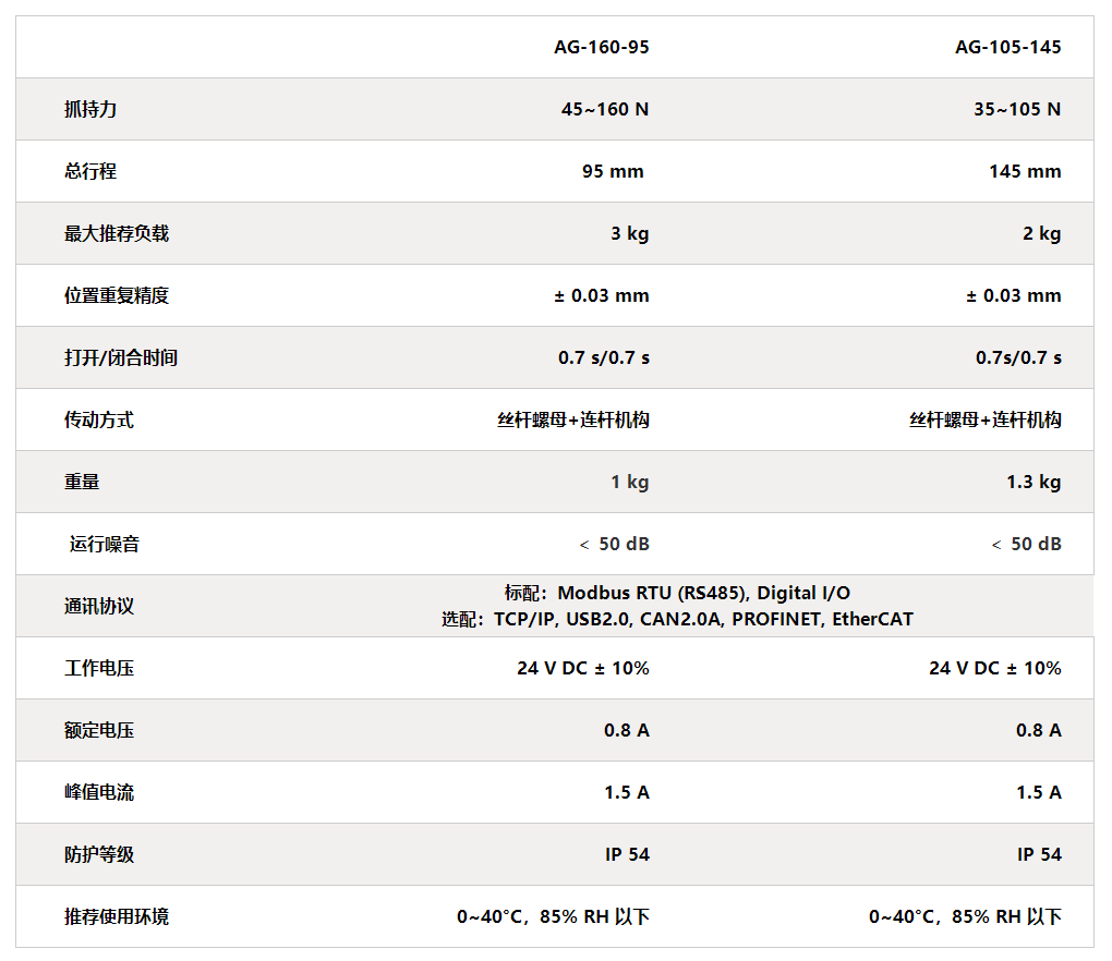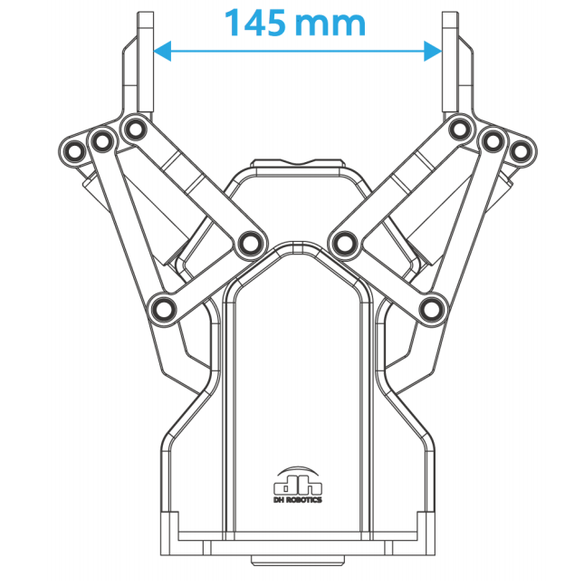 在適配手爪默認(rèn)的標(biāo)準(zhǔn)指尖時(shí),夾爪完全閉合時(shí)指尖距離為 0mm,夾爪完全打開后指尖水平間距為 145mm。在運(yùn)動(dòng)過程中,兩關(guān)節(jié)同步對稱運(yùn)行,在運(yùn)動(dòng)過程中關(guān)節(jié)手指可在指定位置停止。當(dāng)夾持工件尺寸超過 AG-145 最大夾持位置時(shí),用戶可根據(jù)實(shí)際情況變更關(guān)節(jié)手指,從而滿足夾持要求。