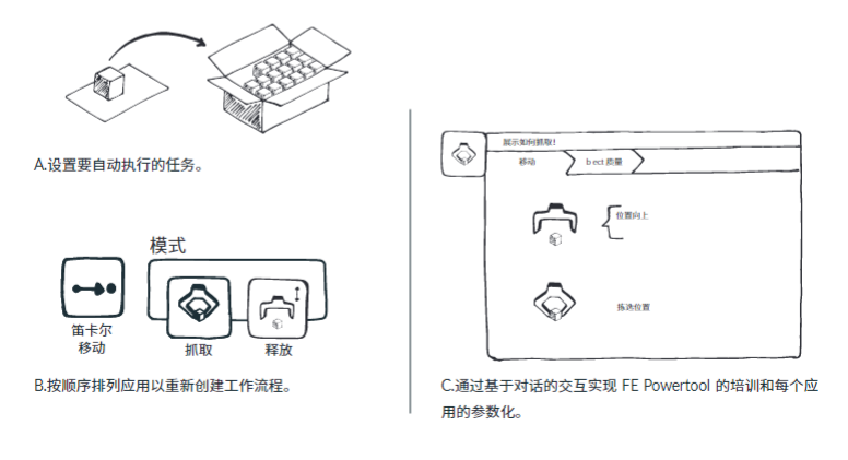 Franka機器人 Powertool (FE Powertool) 提供基于工作流程的最簡單、最快速的用戶體驗。機器人的 App 應用使整個系統(tǒng)的復雜因素簡單化,并以建立模塊化的方式展現(xiàn)整個生產流程(例如抓取、堵塞、插入和擰緊)的各個模塊化構建塊。使用 Franka Emika 基于瀏覽器的桌面接口,可將應用加以排列,以便立即創(chuàng)建整個任務。這些任務可在多個機器人上快速調整、復制或部署,從而顯著降低設置成本。各個應用和任務可通過以下方式實現(xiàn)參數(shù)化:通過演示功能顯示 FE Powertool 位姿;或者添加諸如速度、持續(xù)時間、作用力和觸發(fā)操作等上下文相關參數(shù)。