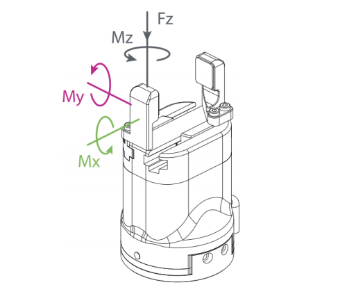 建立如下直角坐標系,X 軸、Y 軸、Z 軸對應方向如下圖所示。以垂直于夾持平面的力作為 Fz;x 軸方向力矩Mx;y 軸方向力矩為 My;z 軸方向力矩為 Mz。