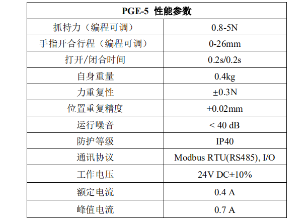 PGE-5 夾爪的具體參數在下表中詳細列出: