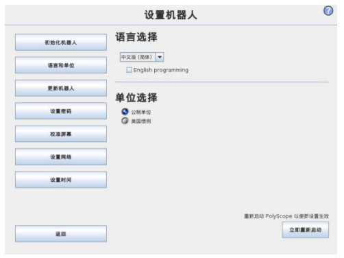 PolyScope 中使用的語言和單位可以在該屏幕設定。PolyScope 上不同屏幕顯示的文本都將以選定的語言顯示,內嵌的幫助文件也將以選定的語言顯示。勾選 “英文編程”,以英文顯示機器人程序內的命令名稱。PolyScope 必須重新啟動,所做更改方可生效。