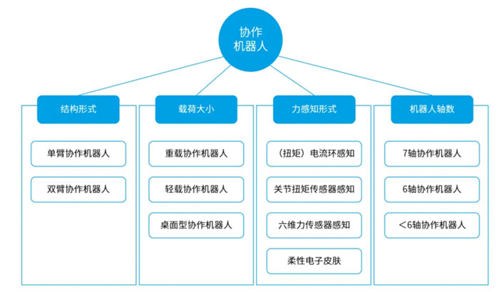 協作機器人主要由機器人本體、中空力矩電機、諧波減速機、伺服驅動器、控制器組成。按照結構形式、載荷大小、力感知方式以及機器人軸數的不同,協作機器人可以分為十多種。