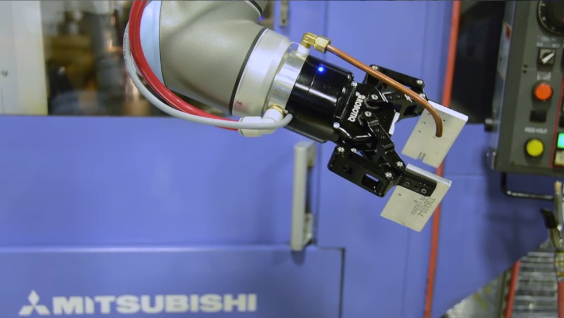 Whippany 自動(dòng)化了一個(gè)協(xié)作機(jī)器人,該機(jī)器人能夠使用 Robotiq 2-Finger Adaptive Gripper 滑動(dòng)打開(kāi)其 CNC 機(jī)床的門(mén),伸手進(jìn)去,取出加工零件并用新的空白零件替換它進(jìn)行加工,然后指示 CNC 機(jī)床開(kāi)始它的工作。