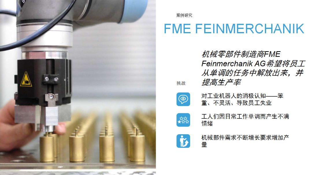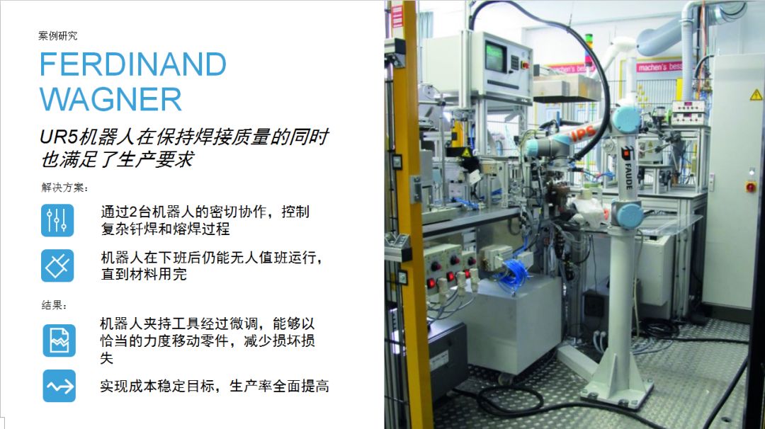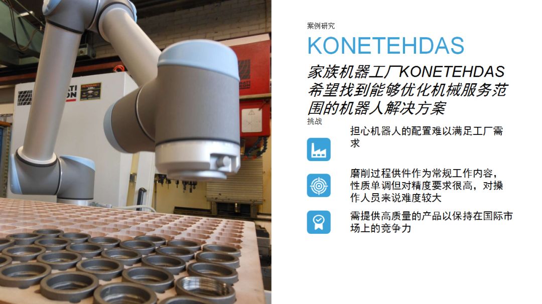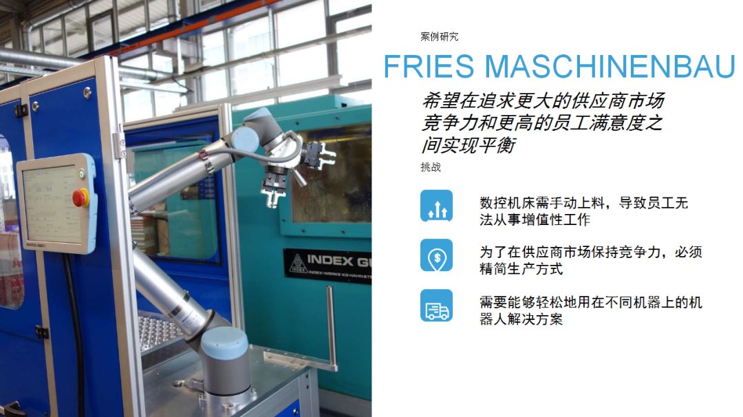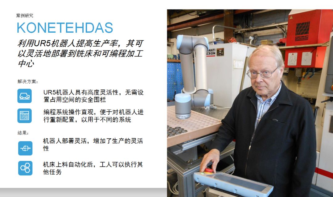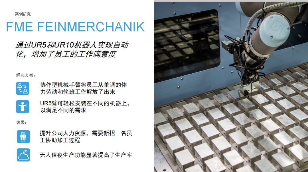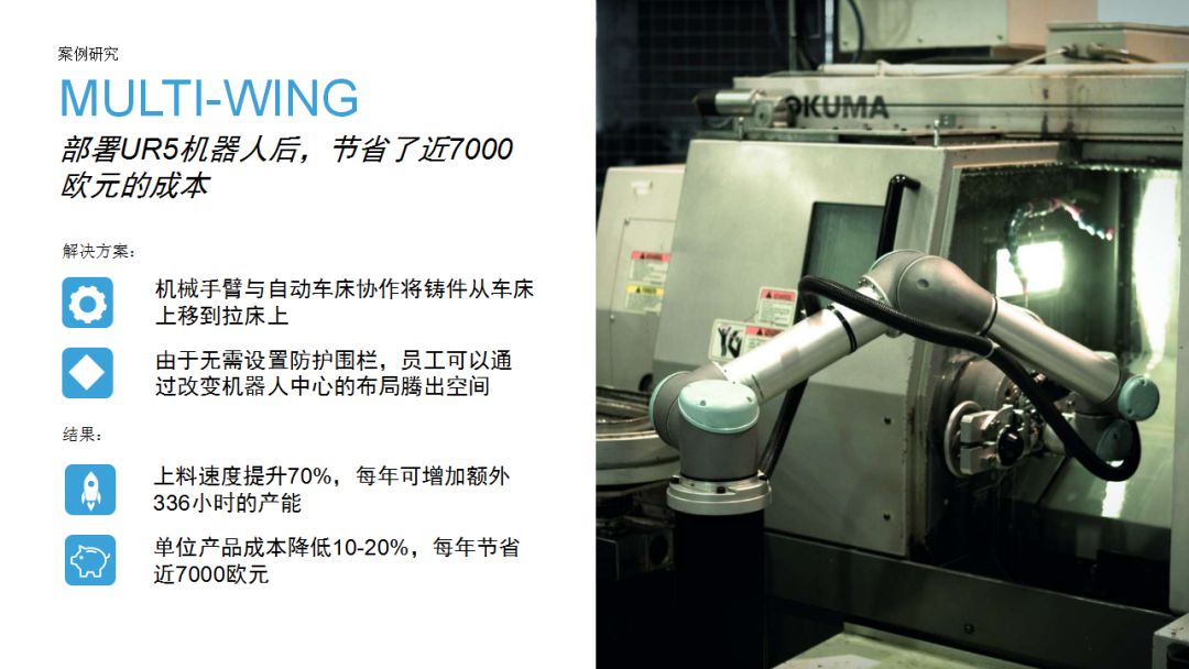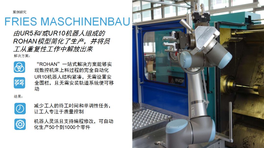 UR機(jī)器人為企業(yè)提供了一種思路:相比傳統(tǒng)工業(yè)機(jī)器人,協(xié)作機(jī)器人成本較低,占地空間小,導(dǎo)入現(xiàn)有工作流程時無需對產(chǎn)線進(jìn)行復(fù)雜和昂貴的重新部署,項目集成周期短。優(yōu)傲機(jī)器人始終堅信,協(xié)作機(jī)器人擁有巨大的潛力,能夠在廣泛的應(yīng)用場景下協(xié)助人類工作。本期內(nèi)容中,協(xié)作機(jī)器人用于金屬加工和機(jī)床上下料,希望這些案例能夠為有類似場景的用戶提供借鑒。