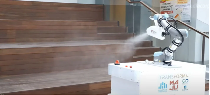 4月中旬,南洋理工大學(xué)(NTU)的研究人員為解決這一問(wèn)題,推出eXtremeDisinfectionroBOT(XDBOT),它由一個(gè)裝有靜電噴嘴的UR5協(xié)作式機(jī)器人組成,安裝在一個(gè)移動(dòng)平臺(tái)上。