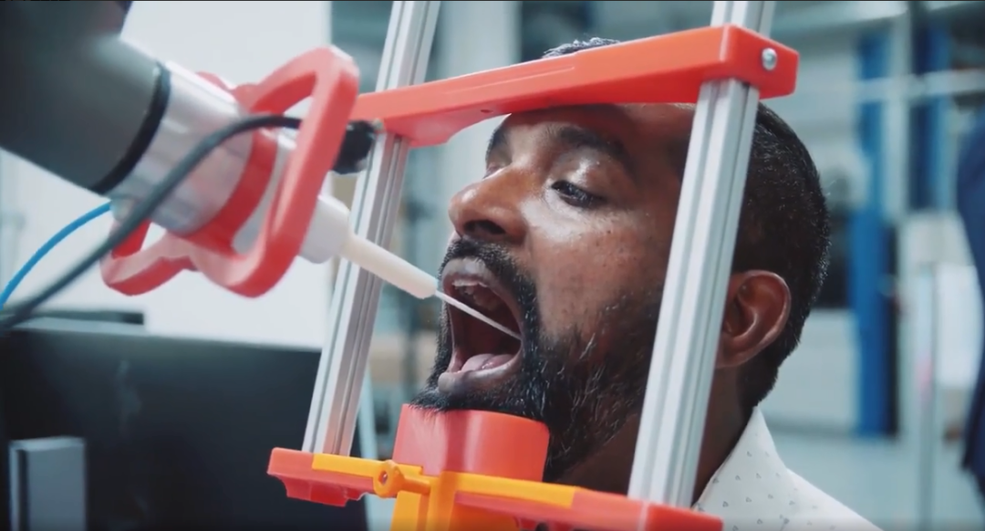 該機(jī)器人由南丹麥大學(xué)的機(jī)器人技術(shù)研究人員合作開發(fā),裝配了UR3協(xié)作式機(jī)器人手臂,以及一個(gè)定制的3D打印末端執(zhí)行器。檢測(cè)的過(guò)程本身非常簡(jiǎn)單,首先掃描病患的身份證。機(jī)器人會(huì)立刻準(zhǔn)備一個(gè)樣品盒,其中包括一個(gè)印有身份信息標(biāo)簽的容器,然后機(jī)器人拿起棉簽。它會(huì)利用內(nèi)置的視覺系統(tǒng),識(shí)別出正確位置,并采集病人的咽部拭子。采集拭子過(guò)程結(jié)束,機(jī)器人會(huì)把樣本放入一個(gè)瓶子當(dāng)中,然后擰上蓋子。瓶子隨后會(huì)被送到實(shí)驗(yàn)室進(jìn)行分析。整個(gè)過(guò)程總共需要7分鐘,而采集拭子本身只需要25秒。該系統(tǒng)于5月底在丹麥正式發(fā)布。