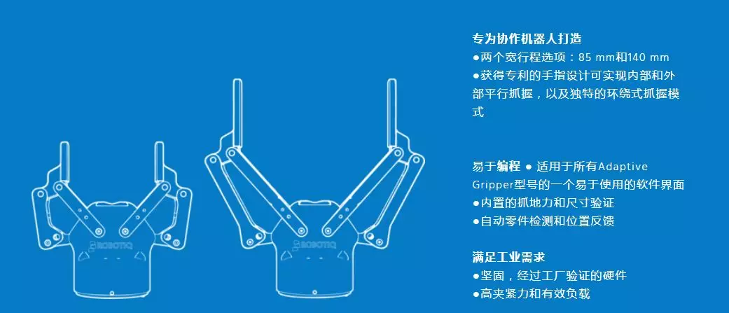 二指夾爪易于集成,可在您工廠的所有自動化單元中使用。它能處理各種尺寸和形狀的部分。 雙指夾爪我們提供了85 mm或140mm行程 消除定制的末端執行器和工具。雙指自適應夾爪與所有主要的工業機器人兼容。我們為Universal Robots提供Plug + Play集成包。