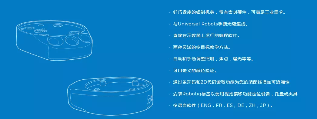 Robotiq腕部相機旨在與Universal Robots一起執行工業應用。教新零件并快速檢測,以確保可重復挑揀。 只需通過30分鐘不到的設置時間,且無需任何編碼。