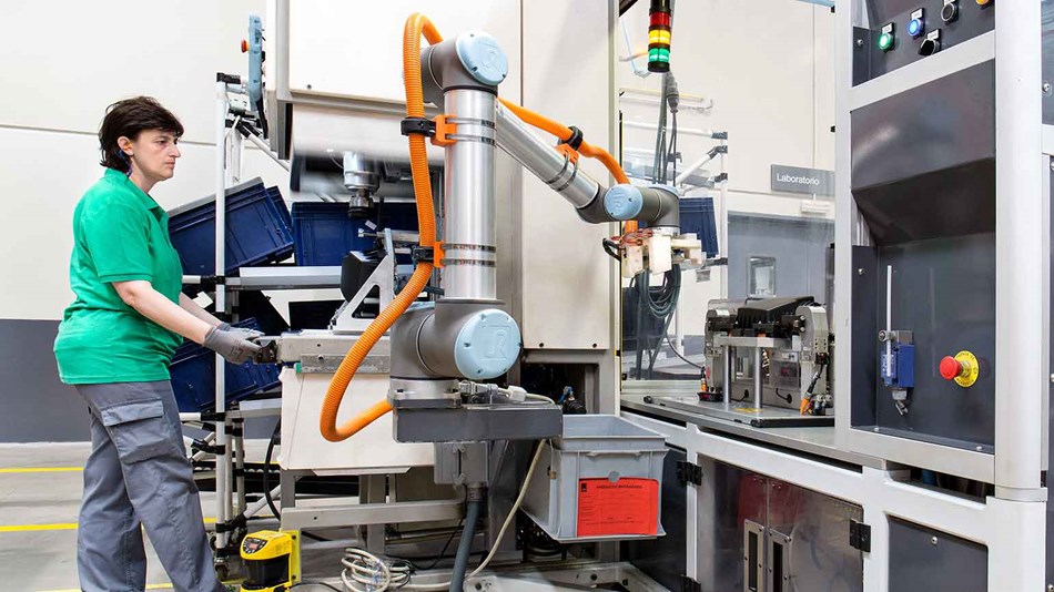 應(yīng)用2:根據(jù)客戶的要求配置組裝單元,在配備單個操作員協(xié)同處理就足夠了。解決方案是添加一個優(yōu)傲機器人,其功能是在焊接機和驗證機之間傳送零件。UR機器人等待,直到零件完成,將其從驗證機器中取出并在需要時將其直接送到操作員的手中。