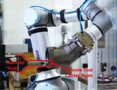 遠程工具中心點(RTCP)使優傲機器人可以在移動工件時保持恒定速度,同時保持與固定工具接觸。
