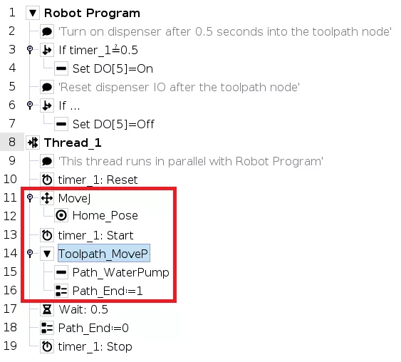 優傲機器人能夠以恒定的速度遵循復雜的軌跡進行移動,從而將凝膠均勻地滴涂到工件上。Polyscope中的程序樹也非常簡潔,無需編寫一長串的路點和圓弧運動。
