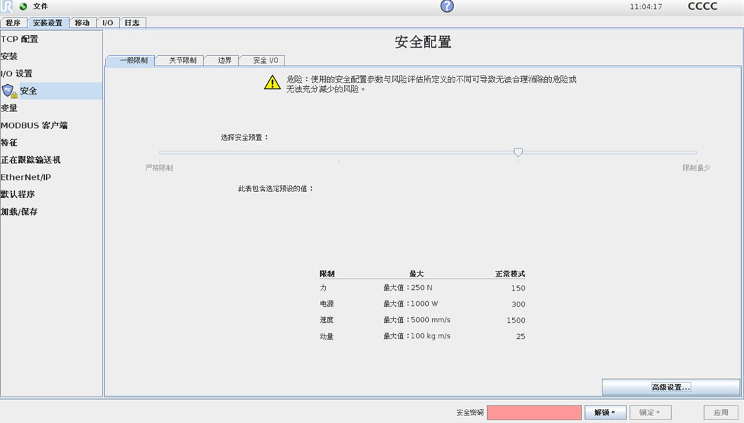 UR機器人對于安全非常重視。為了確保安全,共設置了安全限制、關節(jié)限制、安全界面、安全I/O四大類安全參數供操作者選擇。操作者可以根據實際情況使用一種或多種安全設置,以確保使用中的安全。所有安全參數的設置需要先輸入安全密碼,然后才能進行修改。