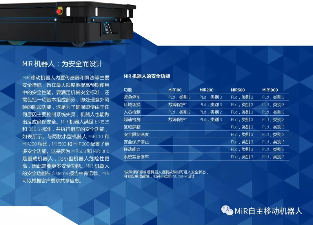 MiR機器人滿足EN 1525和美國相應(yīng)標(biāo)準ANSI / ITSDF標(biāo)準B56.5-2012,產(chǎn)品設(shè)計面向未來標(biāo)準,如ISO/FDIS 3691-4、ISO/FDIS 10218、RIA 15:08以及UL 3100,配備各類相關(guān)安全功能,以確保即使主要安全功能發(fā)生故障,機器人也能做出反應(yīng)確保安全。MiR機器人的安全功能在Sistema報告中有記載,MiR可以根據(jù)客戶要求共享信息。